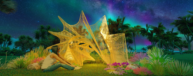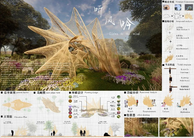 我院学子作品设计源自海螺,每个人年少时都会对大海有憧憬,海螺象征着倾听,听我们内心的声音,不忘年少的梦想。正是这一番梦想的诠释,打动了所有成员的内心,让“听风吟”成为最终主题。以风为纽带,人们在蜿蜒曲折的“风隧道”中听风吟唱,观四时之景,感鸟语花香,织心灵之网,寻本我归途。人于其中观赏,冥想、休憩、娱乐,放下尘世喧嚣,倾听内心的回响,不忘初心,坚守本性。