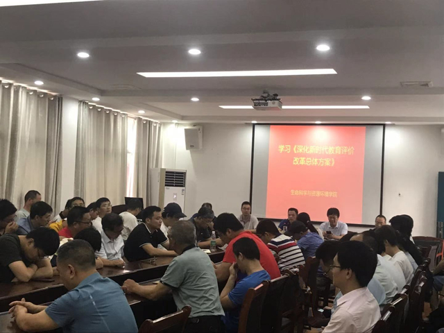 为深入贯彻习近平总书记关于教育的重要论述和全国教育大会精神,全面落实《深化新时代教育评价改革总体方案》要求,2021年6月23日下午三点,生科学院于逸夫楼三楼院会议室召开《<深化新时代教育评价改革总体方案>文件及解读》专题学习会议。生科学院党委书记李春林,院长丁永电,党委副书记陈路扬,副院长卢其能、郭冬生出席本次会议,全体教职工参加。