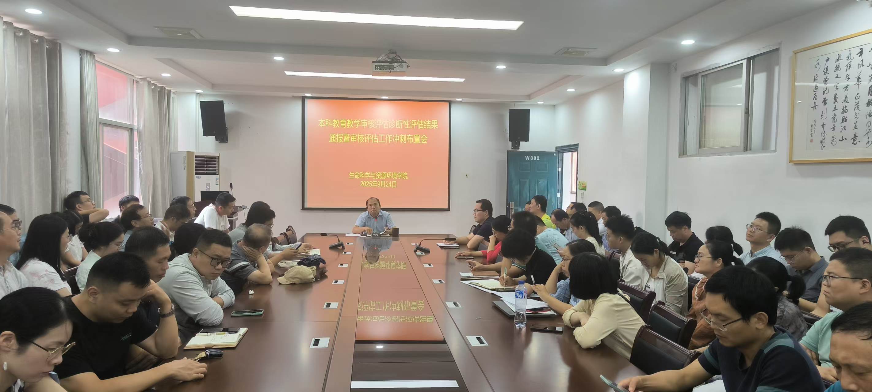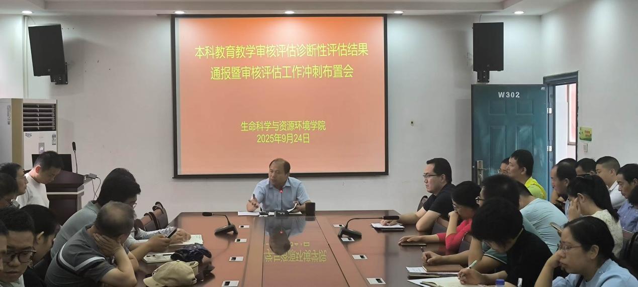 为全面推进本科教育教学审核评估工作,确保评估任务高质量完成,9月24日,我院于逸夫楼W302召开本科教育教学审核评估诊断性评估结果通报暨审核评估工作冲刺布置会,全体教师参加会议,会议由郭冬生院长主持,副院长刘犇通报审核评估诊断性检查结果并作下一步工作部署。