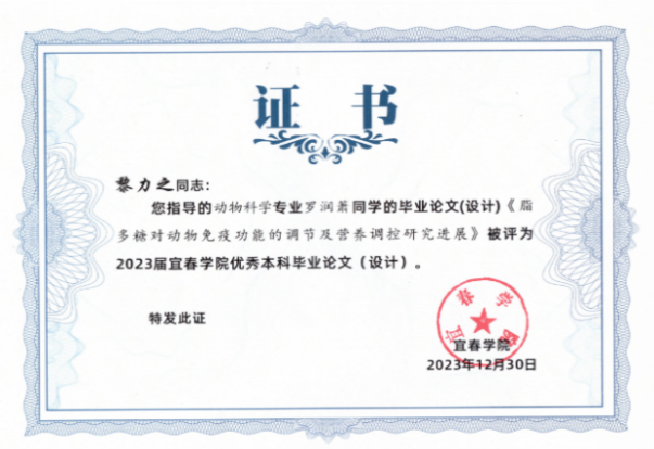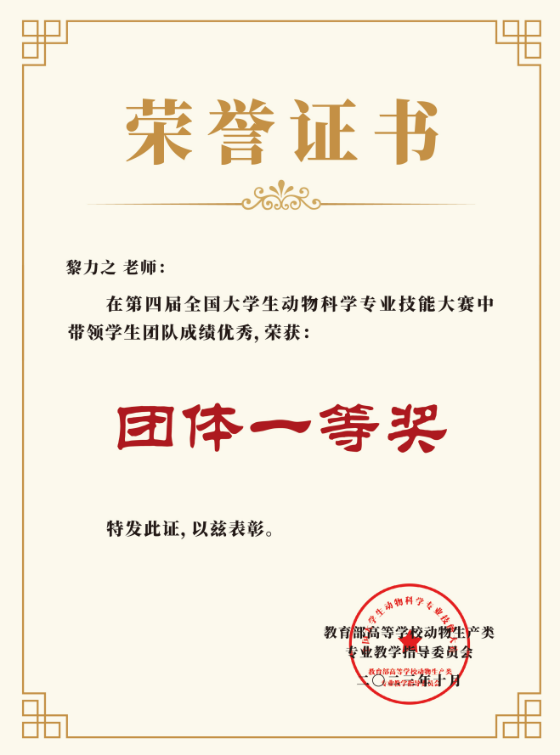 黎力之老师作为江西省应用型本科教育专职高级“双师型”教师,坚持言传身教,落实立德树人根本任务,注重学生科学思维方法训练和实践能力的培养。不仅在课堂上共建师生学习共同体,还在课外带领学生积极开展试验研究、学科竞赛,提高学生自主学习积极性和合作能力。目前,她已指导本科生发表32篇中文核心期刊论文,其中学生作为第一作者论文9篇,学生参与发表中科院一区SCI论文4篇,中科院二区论文1 篇;同时,指导学生获第四届全国大学生动物科学专业技能大赛一等奖,第七届全国大学生动物医学专业(本科)技能大赛一等奖,第五届全国大学生动物科学专业技能大赛二等奖等。黎力之老师作为2023届动物科学2班的班主任,所带班级学生3人荣获优秀毕业生,2人的论文被评为优秀本科毕业论文;班级在当年全校考研录取率中排名第2,多名学生赴华南农业大学、四川农业大学和南京农业大学等双一流高校深造。