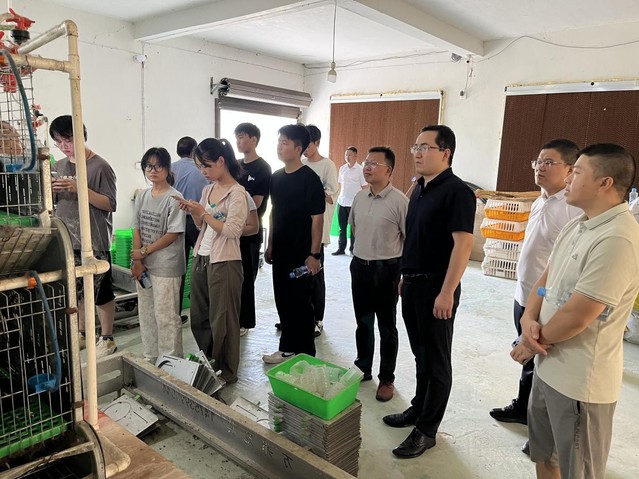 在示范基地,师生团队一行受到基地总经理韩国荣和东江村党支部书记李刘根等人的热情接待。韩国荣带领大家参观了园区,详细介绍了万载黑兔在育种繁殖、饲养管理、疫病防控、产品加工及品牌建设等方面的实践情况。学生党员认真记录、踊跃提问,积极向一线技术人员请教细节,展现了青年党员扎实的专业素养和务实的学习态度。