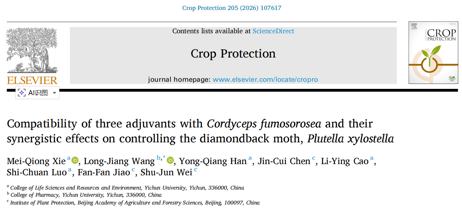 2026年3月14日,我院谢梅琼团队在农林科学领域国际知名期刊《Crop Protection》(SCI 2区)在线发表了题为“Compatibility of three adjuvants with Cordyceps fumosorosea and their synergistic effects on controlling the diamondback moth, Plutella xylostella”的研究论文,揭示了提升生物农药玫烟色棒束孢对小菜蛾防治效果的关键技术。